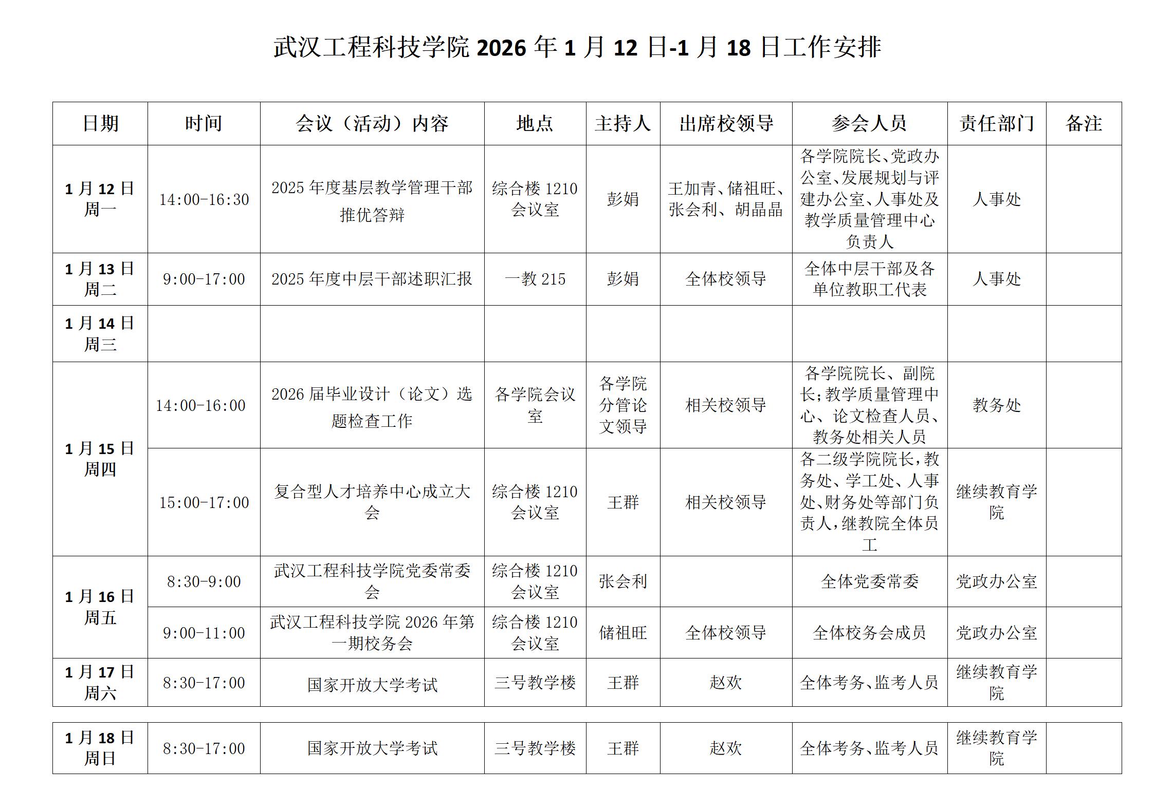 学校2026年1月12日-1月18日工作安排